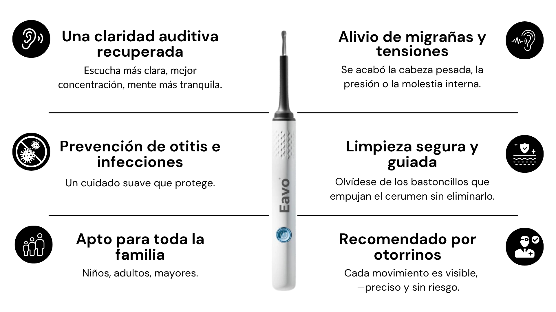 A diferencia de los bastoncillos de algodón, que empujan el cerumen hacia el fondo, Eavo® Pro lo elimina suavemente, siguiendo las recomendaciones de los especialistas ORL.