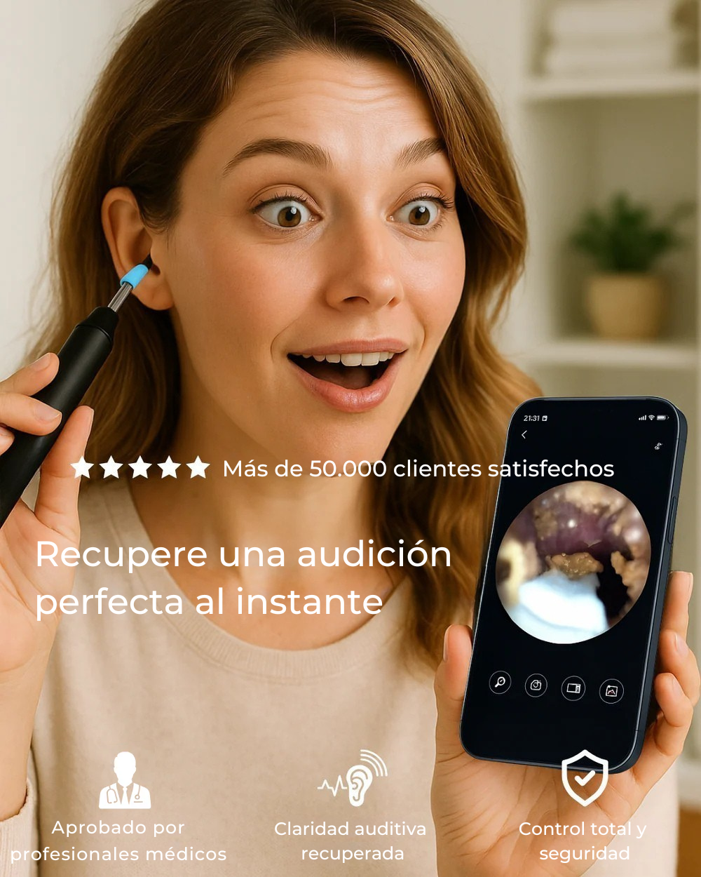 La aplicación dedicada te muestra en directo el interior del oído, para una limpieza precisa, visible y sin riesgo.